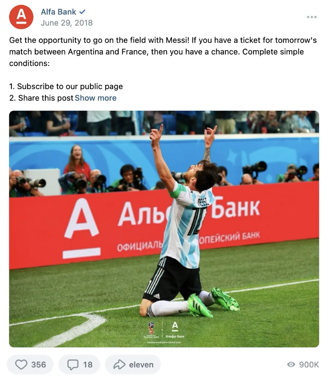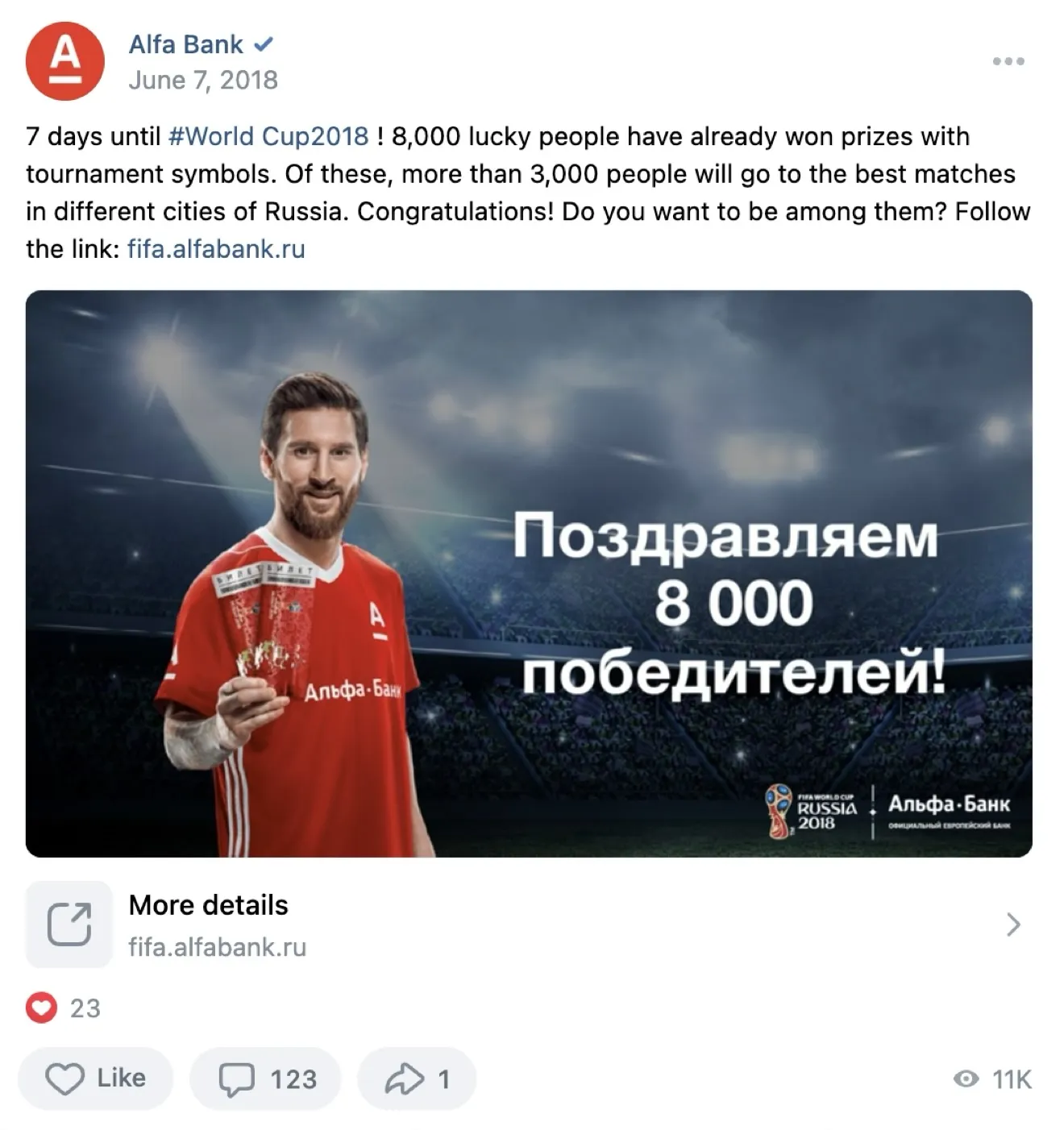 During the FIFA World Cup 2018, we built and executed the joint Alfa-Bank and Visa social media strategy, blending global star power with local fan engagement. The campaign featured Lionel Messi across promo materials, interactive activations, and special projects that gave fans the chance to win tickets to the championship. We also managed influencer partnerships — organizing bloggers and opinion leaders to attend matches and amplify the campaign. The approach generated huge traction both online and offline — driving the issuance of 100,000+ new co-branded cards during the tournament.
